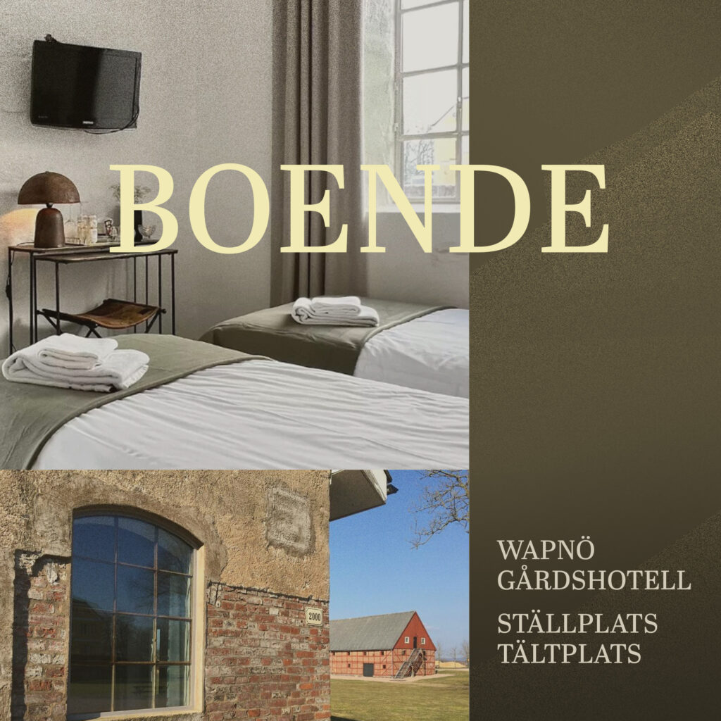 Wapnö arrangerar årligen flera återkommande mässor och på den stora parkeringen har ni möjlighet att parkera husvagn eller husbil. Wapnö Gårdshotell erbjuder enkelt och lantligt boende i tvåbäddsrum. Utöver detta finns stora gräsytor för tältplats.