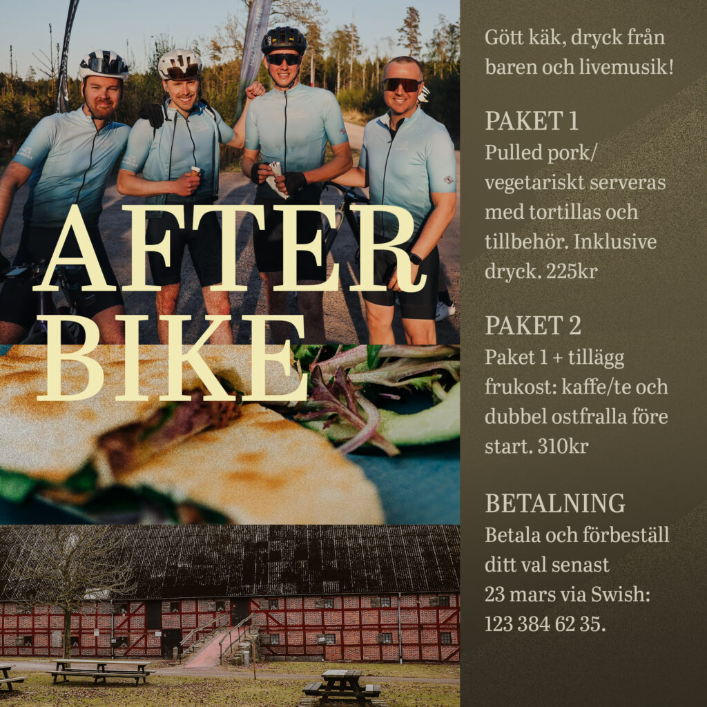 När vi rullar in på Wapnö efter detta äventyr är det äntligen dags för AFTER BIKE. På slottet från ca kl 15.00 serveras de GÖTT KÄK och dryck från BAREN, ackompanjerat av LIVEMUSIK! Detta vill vi verkligen uppmana alla deltagare att medverka på, dels då det är en viktig del av Dirty Halland Spirit, och dels för vår värd Wapnö som gör detta möjligt.