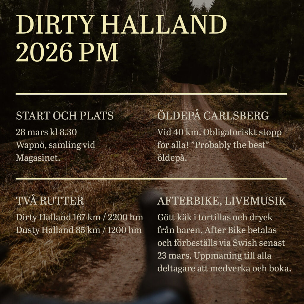 Dirty Halland är inget race. Det är en go, äventyrlig, upplevelsedag på cykeln, nya gemenskaper, en alkoholfri Carlsberg längs vägen och en go afterbike. För att alla ska få möjlighet är det gratis att cykla Dirty Halland. Men vi vill verkligen uppmana er alla att boka afterbike hos årets värd Wapnö, som gör detta möjligt. Vi tar det lugnt vid korsande av vägar, skymda kurvor och vid passering genom gårdar ute på landsbygden. Och allt skräp hamnar i bakfickorna.
